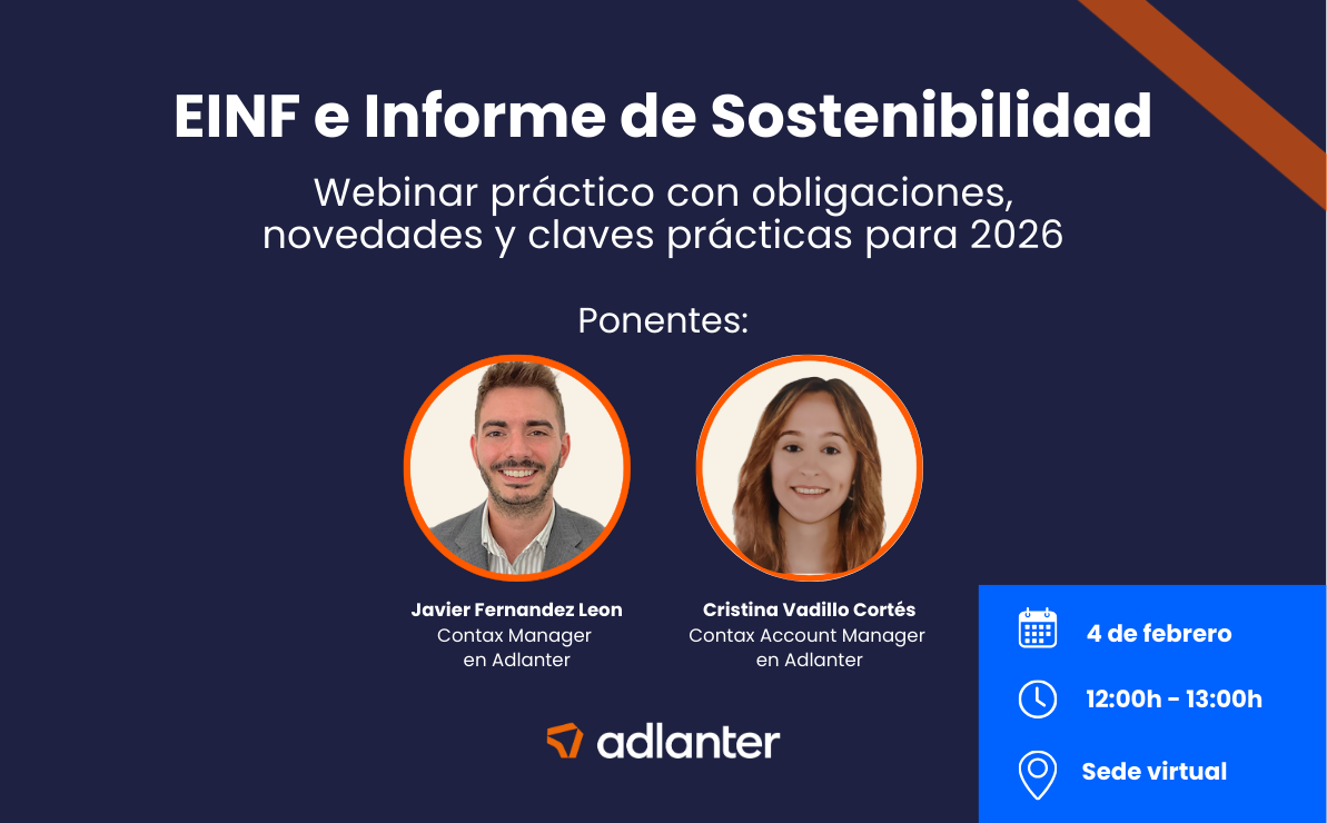 En nuestro webinar gratuito del 4 de febrero a las 12:00 h, expertos de Adlanter explicarán de manera práctica todo lo que necesitas saber: tipos de EINF, obligaciones de publicación, contenidos esenciales y las novedades estratégicas del Informe de Sostenibilidad.
