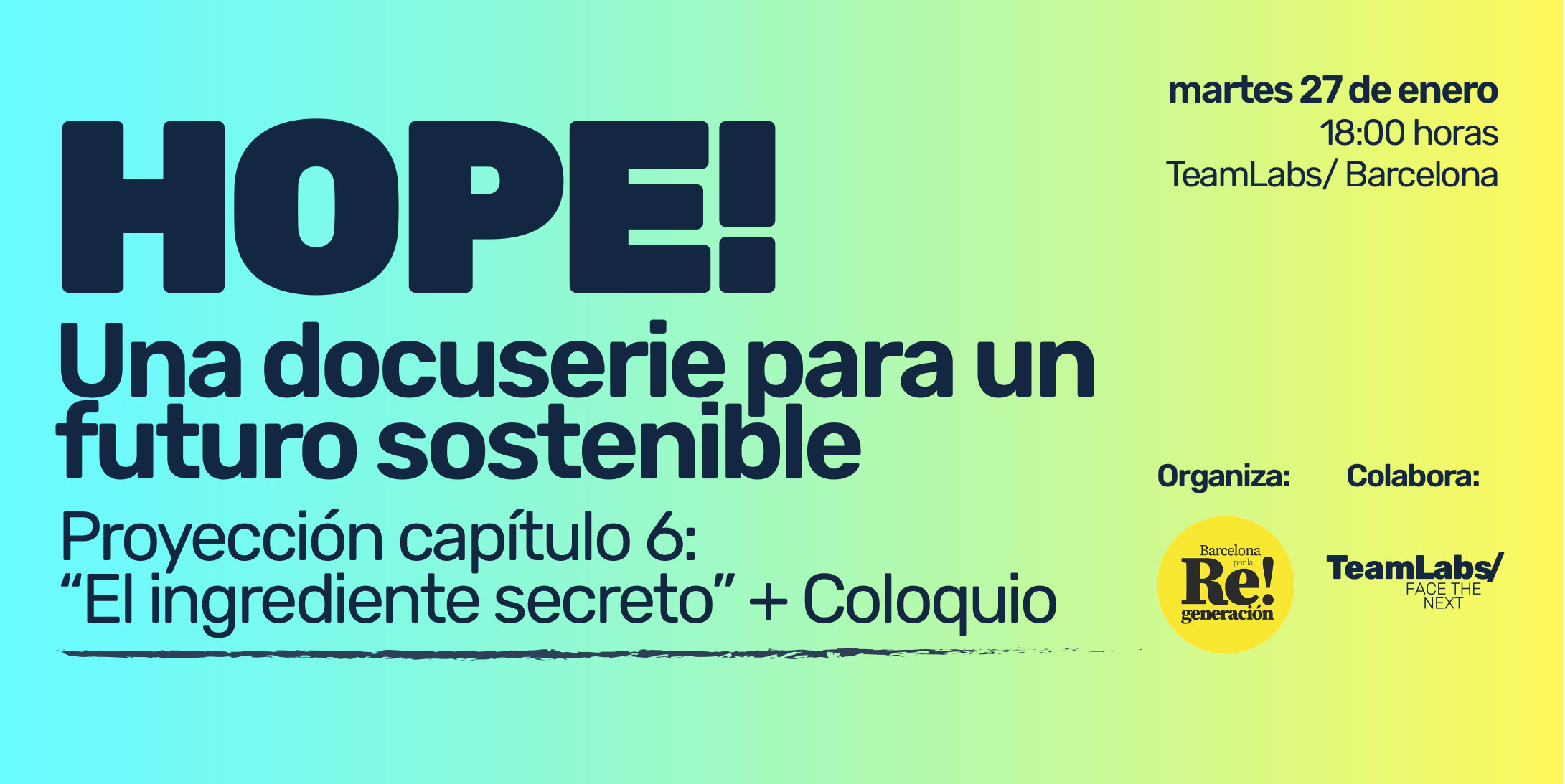 Proyección del Episodio final de HOPE, el documental que ofrece las claves para dar la vuelta a la emergencia climática el próximo 27 de enero a las 18h en el laboratorio de TeamLabs Barcelona (edificio Barcelona Circular).